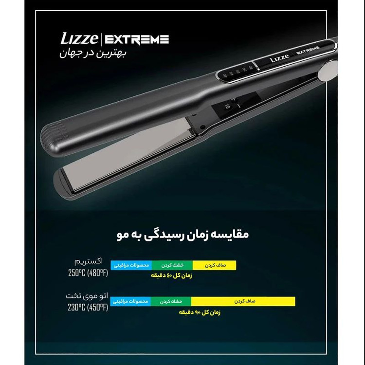 با استفاده از اتو مو لیز اکستریم Lizze Extreme، میتوانید بهسرعت و با اطمینان موهای خود را صاف و درخشان کنید و از ظاهری جذاب و مرتب لذت ببرید.